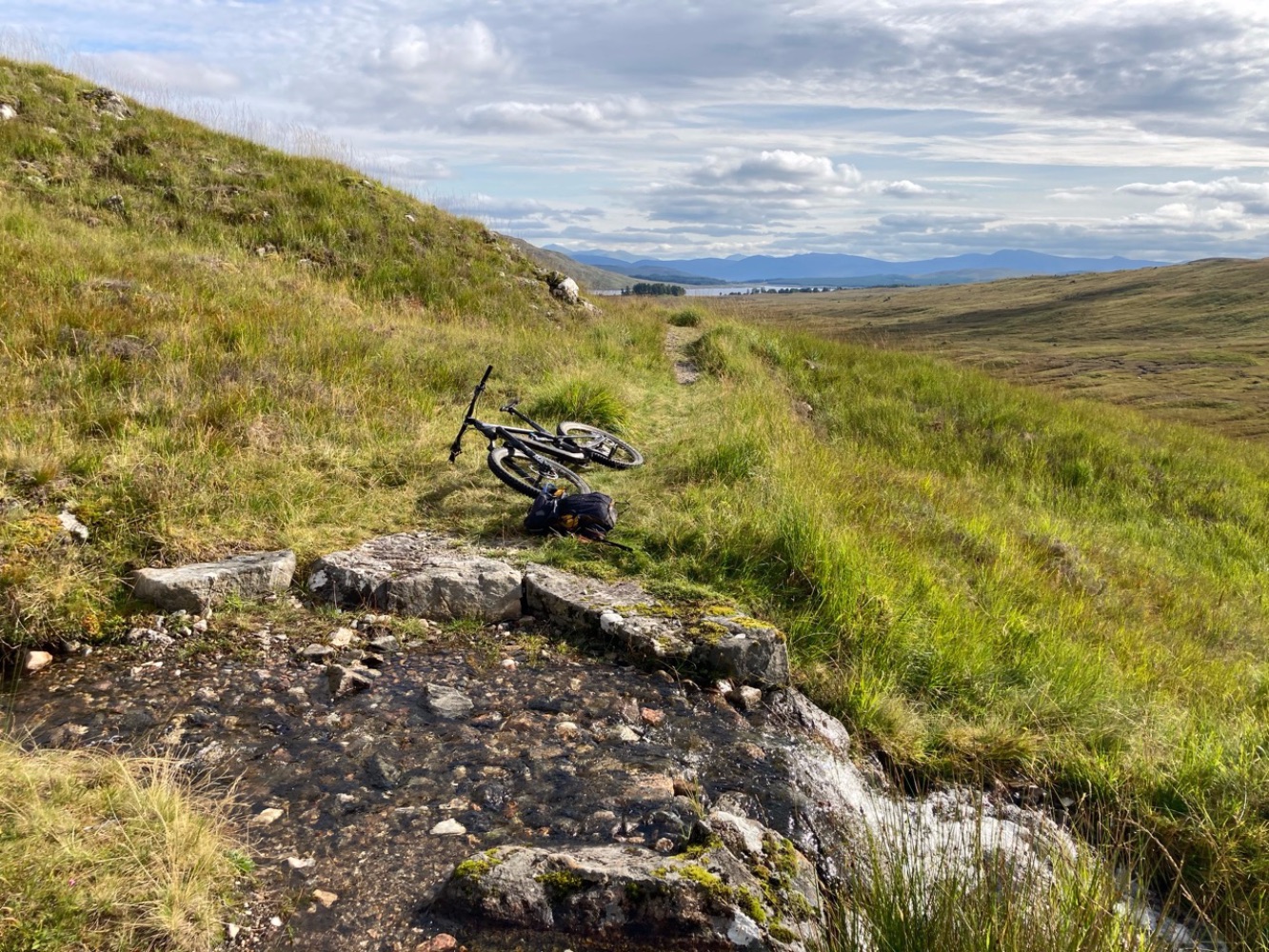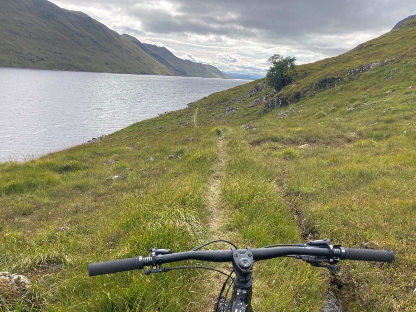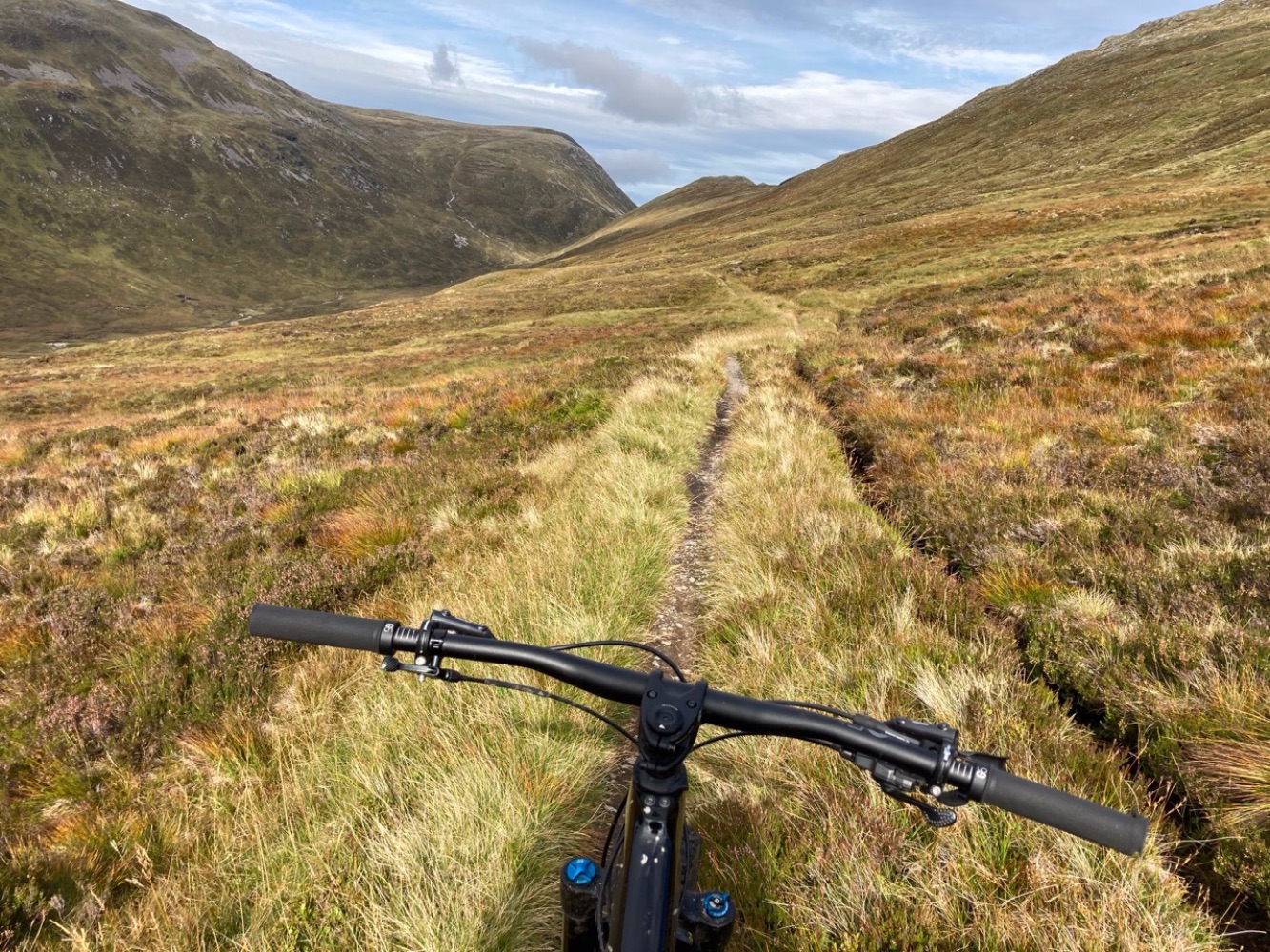 This route goes clockwise and avoids Bealach Breabag by starting with a ride along the shore of Loch Ericht with only a short section of hike-a-bike round An Dun (the headland before Ben Alder Cottage).